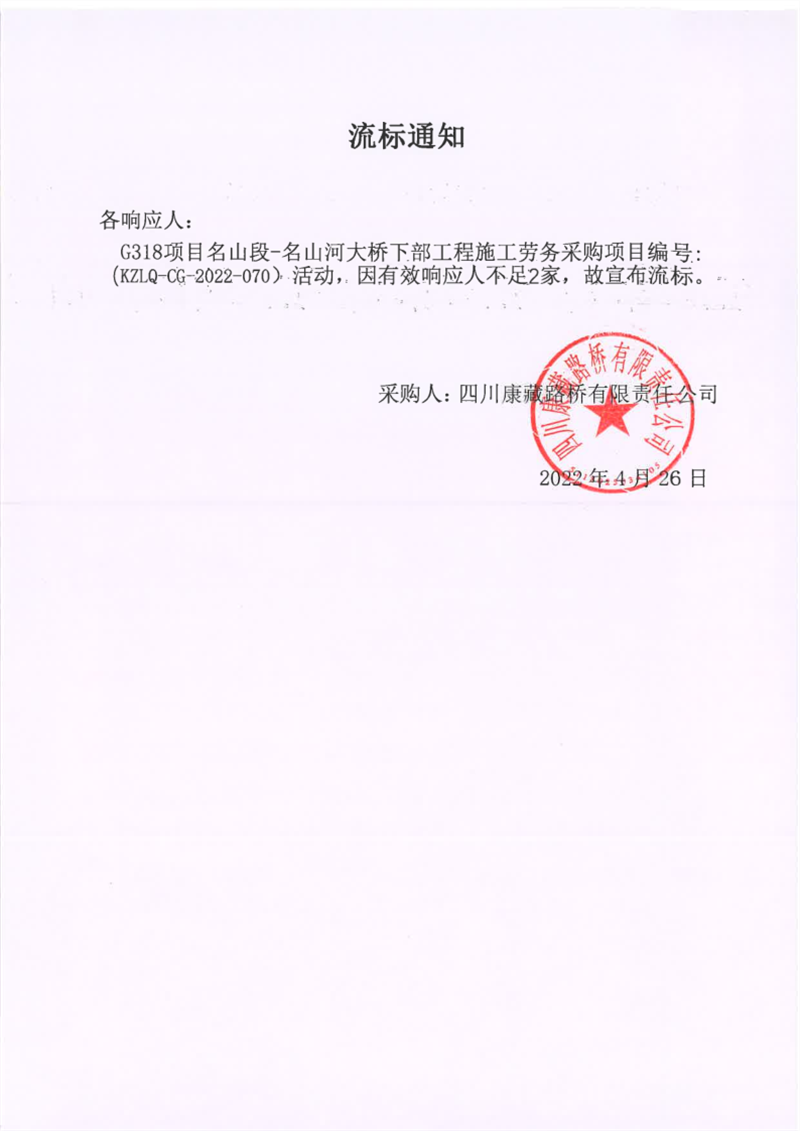 四川康藏路橋有限責(zé)任公司G318項(xiàng)目名山段-名山河大橋下部工程施工勞務(wù)采購(gòu)項(xiàng)目流標(biāo)通知