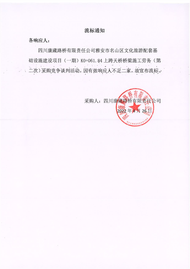 四川康藏路橋有限責(zé)任公司雅安市名山區(qū)文化旅游配套基礎(chǔ)設(shè)施建設(shè)項(xiàng)目(一期)K0+061.84上跨天橋橋梁施工勞務(wù)(第二次)流標(biāo)通知