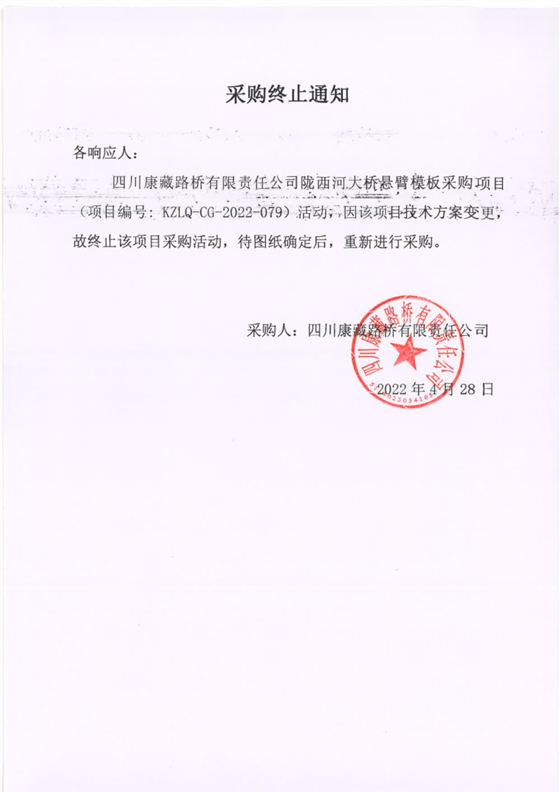四川康藏路橋有限責任公司隴西河大橋懸臂模板采購終止通知