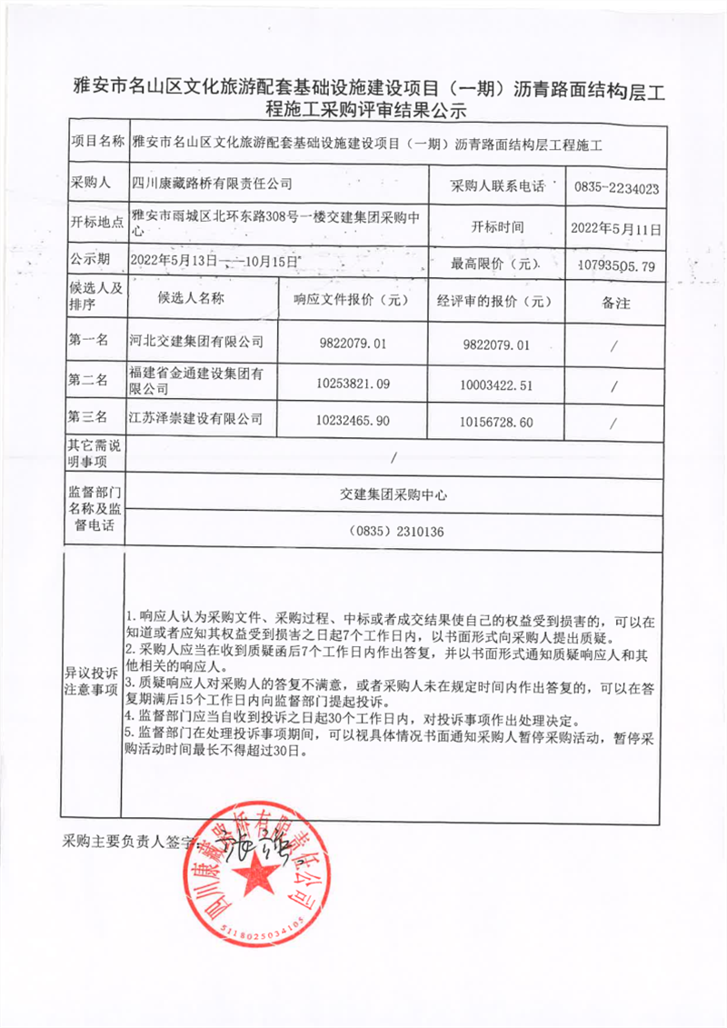 四川康藏路橋有限責(zé)任公司雅安市名山區(qū)文化旅游配套基礎(chǔ)設(shè)施建設(shè)項目(一期)瀝青路面結(jié)構(gòu)層工程施工采購評審結(jié)果公示