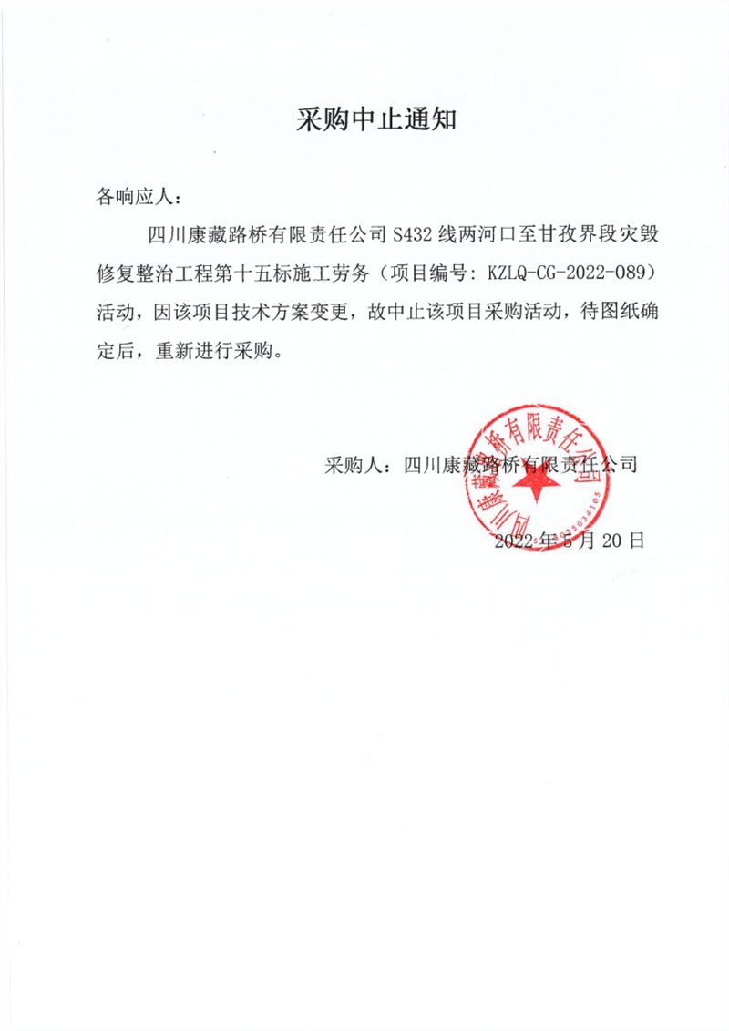四川康藏路橋有限責任公司S432線寶興縣兩河口至甘孜界段災(zāi)毀修復(fù)整治工程第十五標施工勞務(wù)采購中止通知