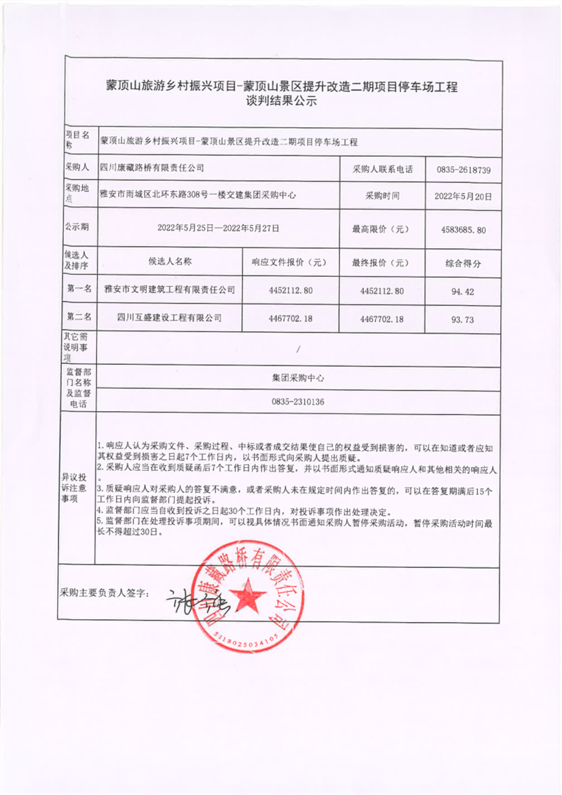 四川康藏路橋有限責任公司蒙頂山旅游鄉(xiāng)村振興項目-蒙頂山景區(qū)提升改造二期項目停車場工程談判結(jié)果公示