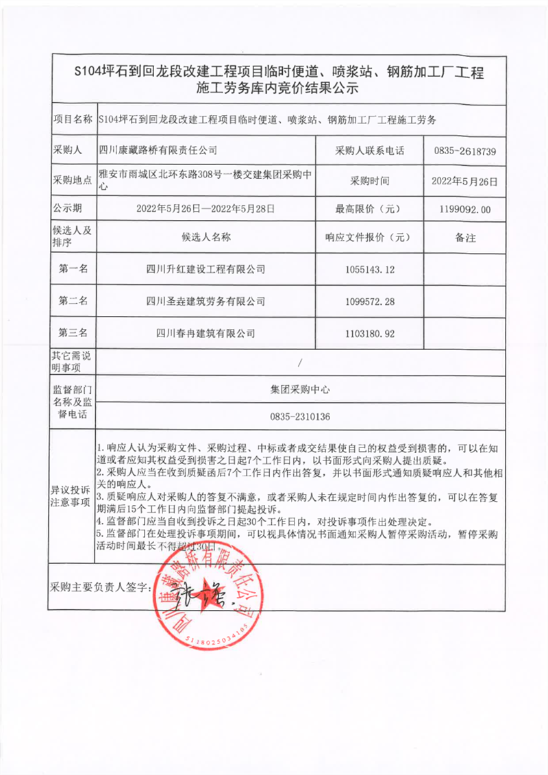 四川康藏路橋有限責(zé)任公司S104坪石到回龍改建工程項(xiàng)目臨時(shí)便道、噴漿站、鋼筋加工廠工程施工勞務(wù)庫內(nèi)競價(jià)結(jié)果公示