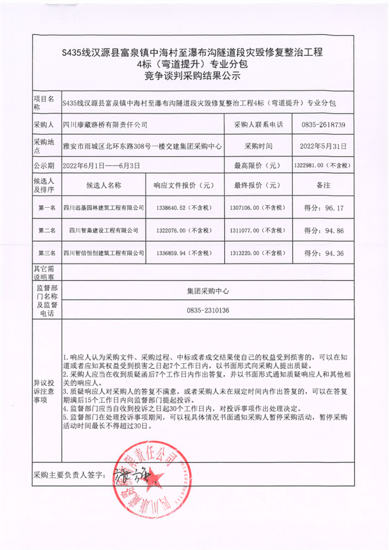 四川康藏路橋有限責(zé)任公司S435線漢源縣富泉鎮(zhèn)中海村至瀑布溝隧道段災(zāi)毀修復(fù)整治工程4標(biāo)(彎道提升)專(zhuān)業(yè)分包競(jìng)爭(zhēng)談判采購(gòu)結(jié)果公示