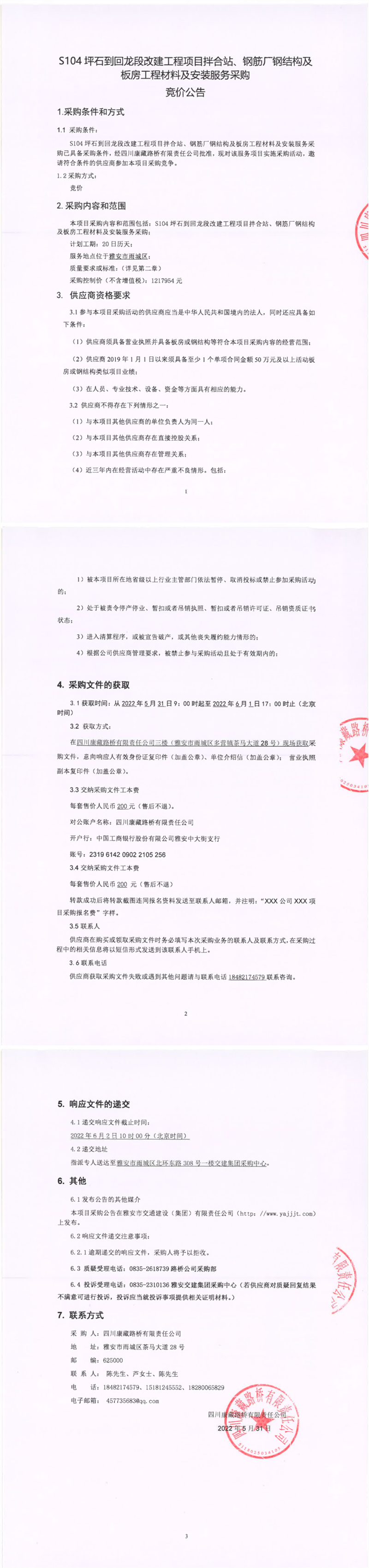 四川康藏路橋有限責(zé)任公司S104坪石到回龍段改建工程項目拌合站、鋼筋廠鋼結(jié)構(gòu)及板房工程材料及安裝服務(wù)采購競價公告