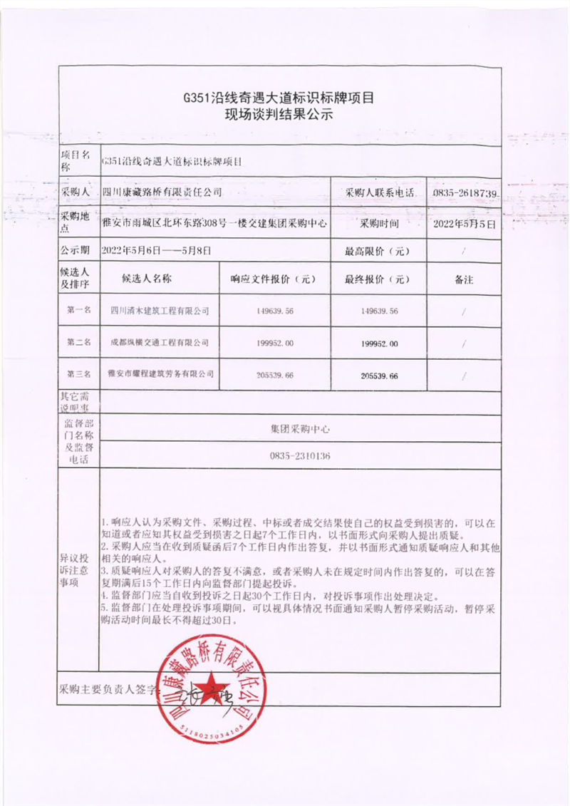 四川康藏路橋有限責任公司G351沿線奇遇大道標識標牌項目現(xiàn)場談判結(jié)果公示