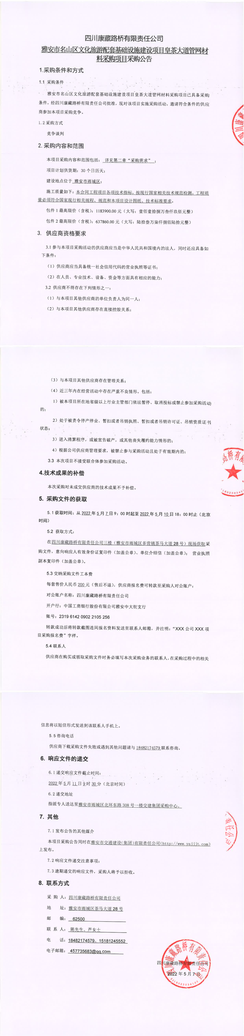 四川康藏路橋有限責(zé)任公司雅安市名山區(qū)文化旅游配套基礎(chǔ)設(shè)施建設(shè)項(xiàng)目皇茶大道管網(wǎng)材料采購項(xiàng)目采購公告