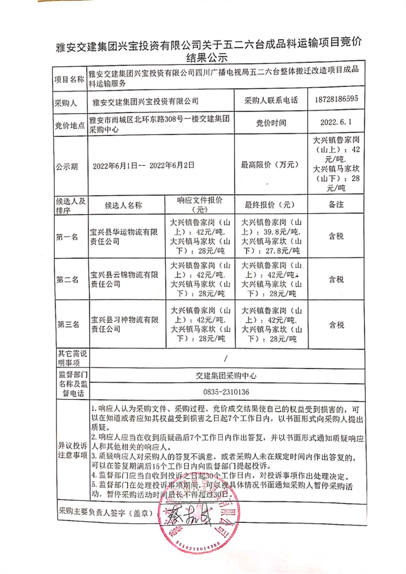 雅安交建集團興寶投資有限公司關于五二六臺成品料運輸項目競價結果公示