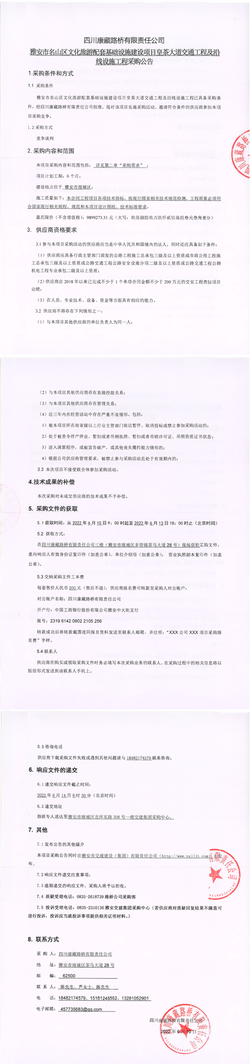 四川康藏路橋有限責(zé)任公司雅安市名山區(qū)文化旅游配套基礎(chǔ)設(shè)施建設(shè)項目皇茶大道交通工程及沿線設(shè)施工程采購公告