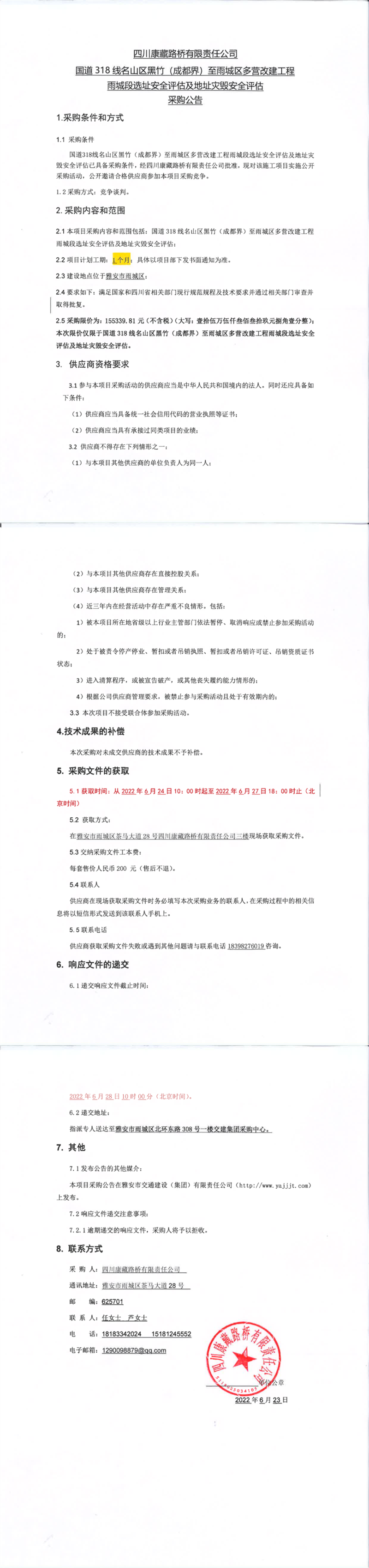四川康藏路橋有限責任公司國道318名山區(qū)黑竹(成都界)至雨城區(qū)多營段改建工程雨城段選址安全評估及地址災(zāi)毀安全評估采購公告
