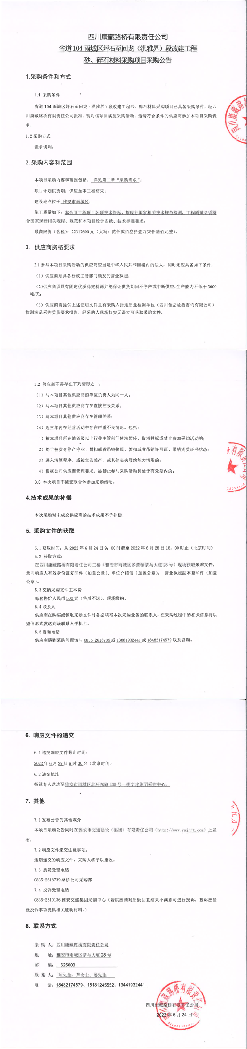 四川康藏路橋有限責任公司省道104雨城區(qū)坪石至回龍(洪雅界)段改建工程砂、碎石材料采購項目采購公告