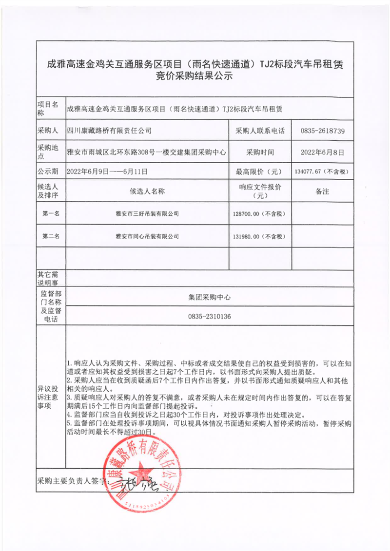 四川康藏路橋有限責(zé)任公司成雅高速金雞關(guān)互通服務(wù)區(qū)項(xiàng)目(雨名快速通道)TJ2標(biāo)段汽車吊租賃競(jìng)價(jià)采購(gòu)結(jié)果公示
