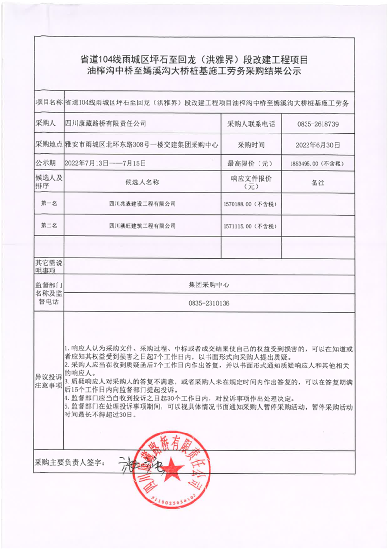 四川康藏路橋有限責(zé)任公司省道104線雨城區(qū)坪石至回龍(洪雅界)段改建工程項(xiàng)目油榨溝中橋至嫣溪溝大橋樁基施工勞務(wù)采購結(jié)果公示