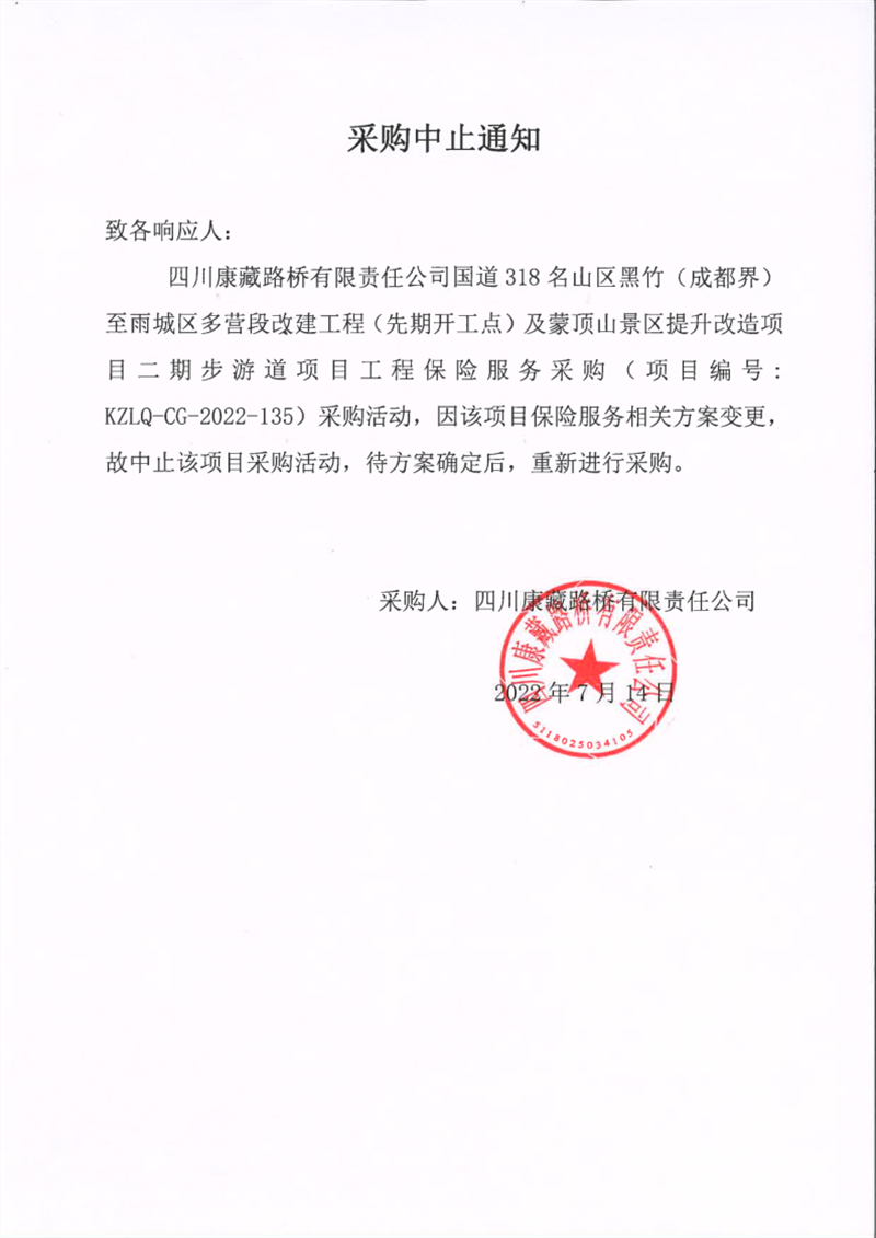 四川康藏路橋有限責(zé)任公司國(guó)道318名山區(qū)黑竹(成都界)至雨城區(qū)多營(yíng)段改建工程(先期開工點(diǎn))及蒙頂山景區(qū)提升改造項(xiàng)目二期步游道項(xiàng)目工程保險(xiǎn)服務(wù)采購(gòu)中止通知