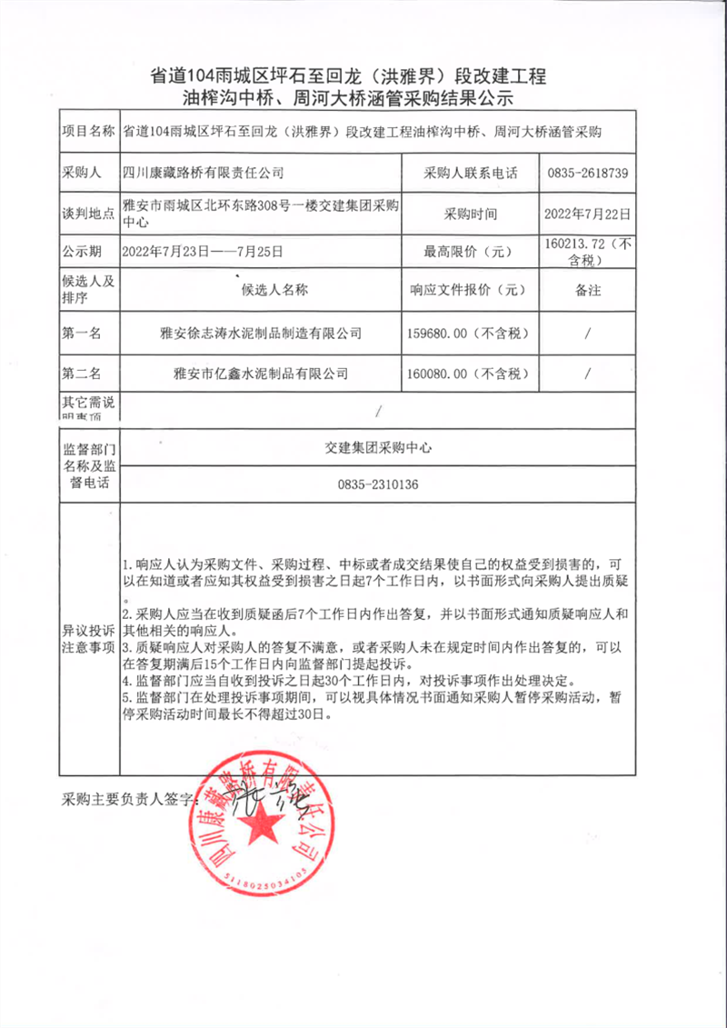 四川康藏路橋有限責(zé)任公司省道104雨城區(qū)坪石至回龍(洪雅界)段改建工程油榨溝中橋、周河大橋涵管采購(gòu)結(jié)果公示