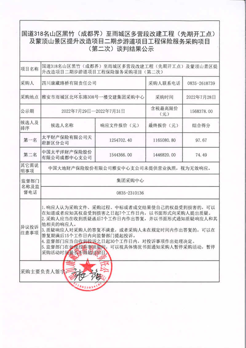 四川康藏路橋有限責(zé)任公司國道318名山區(qū)黑竹(成都界)至雨城區(qū)多營段改建工程(先期開工點)及蒙頂山景區(qū)提升改造項目二期步游道項目工程保險服務(wù)采購項目(第二次)談判結(jié)果公示
