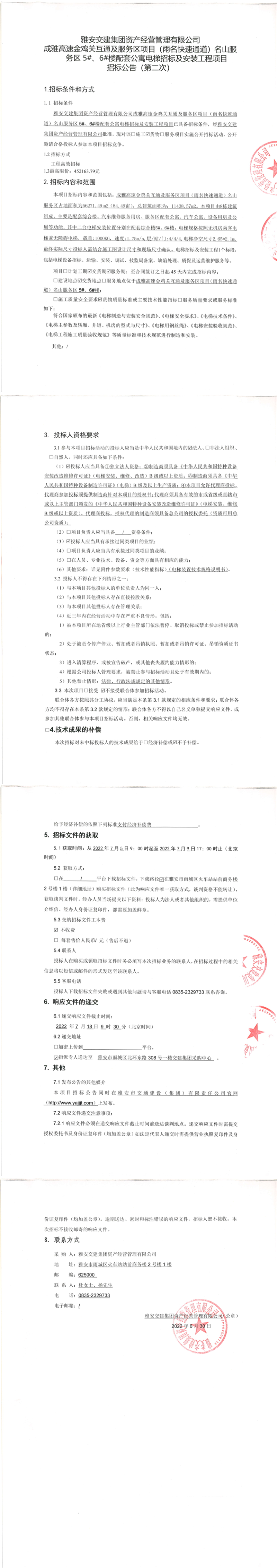 雅安交建集團(tuán)資產(chǎn)經(jīng)營管理有限公司成雅高速金雞關(guān)互通及服務(wù)區(qū)項目(雨名快速通道)名山服務(wù)區(qū)5#、6#樓配套公寓電梯招標(biāo)及安裝工程項目招標(biāo)公告(第二次)