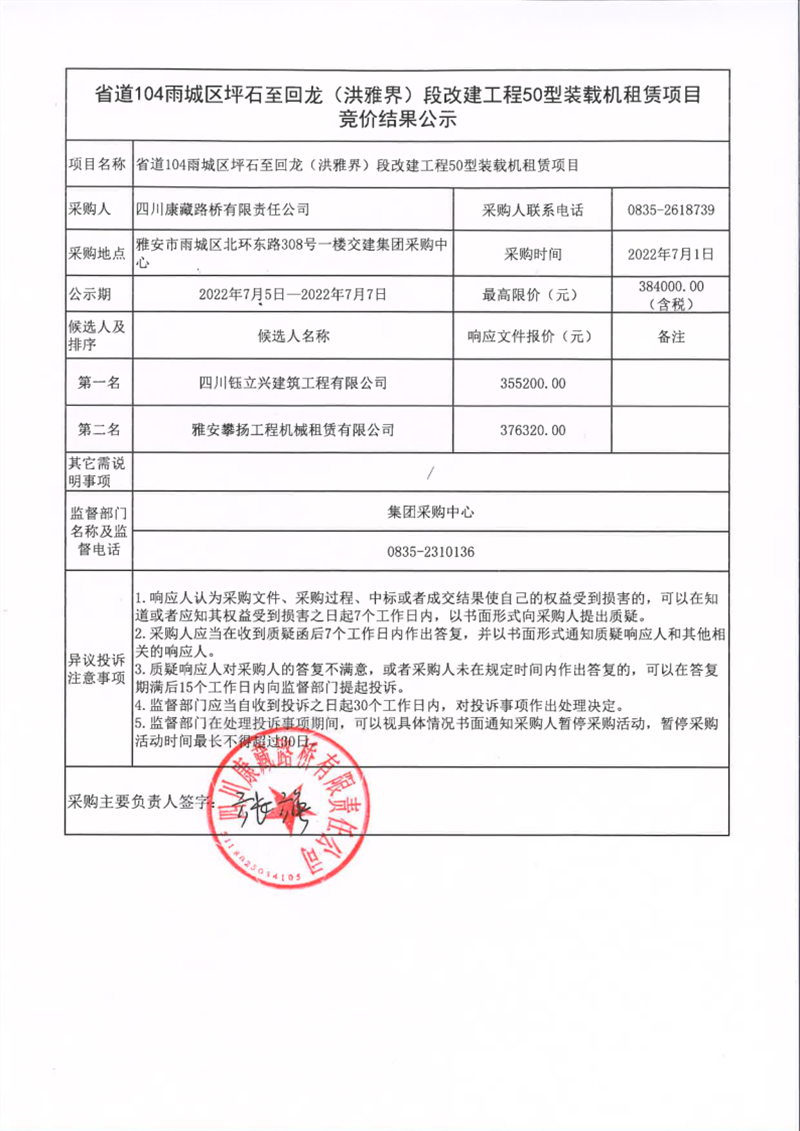 四川康藏路橋有限責(zé)任公司省道104雨城區(qū)坪石至回龍(洪雅界)段改建工程50型裝載機租賃項目競價結(jié)果公示