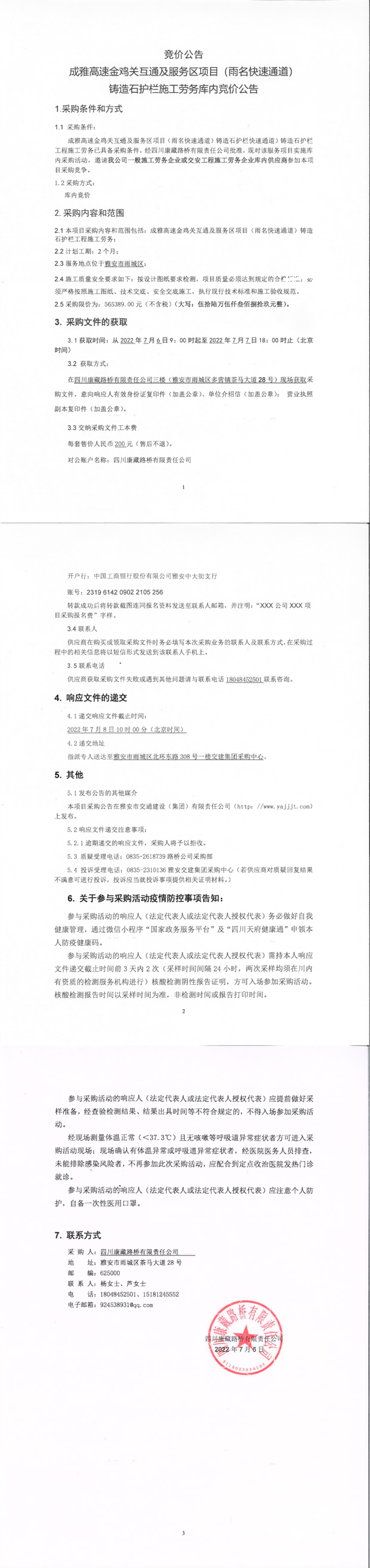 四川康藏路橋有限責(zé)任公司成雅高速金雞關(guān)互通及服務(wù)區(qū)項(xiàng)目(雨名快速通道)鑄造石護(hù)欄施工勞務(wù)庫內(nèi)競價公告