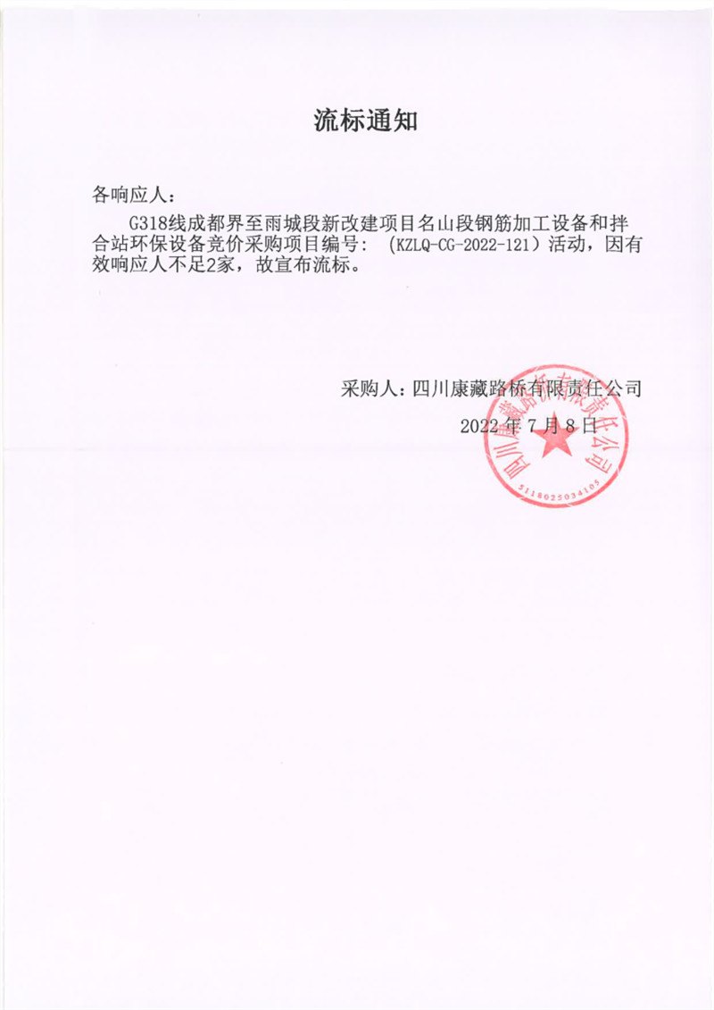 四川康藏路橋有限責(zé)任公司G318線成都界至雨城段新改建項(xiàng)目名山段鋼筋加工設(shè)備和拌合站環(huán)保設(shè)備競(jìng)價(jià)采購項(xiàng)目流標(biāo)通知
