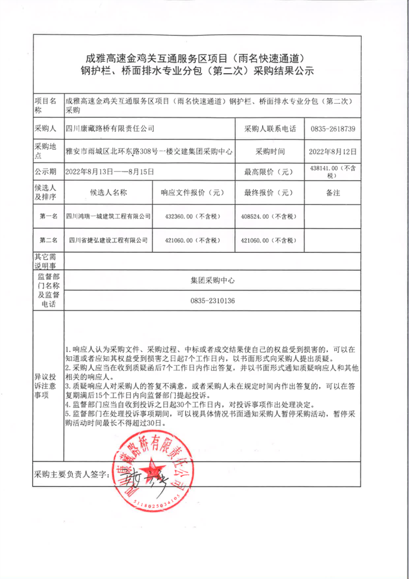 四川康藏路橋有限責(zé)任公司成雅高速金雞關(guān)互通服務(wù)區(qū)項(xiàng)目(雨名快速通道)鋼護(hù)欄、橋面排水專業(yè)分包(第二次)采購(gòu)結(jié)果公示