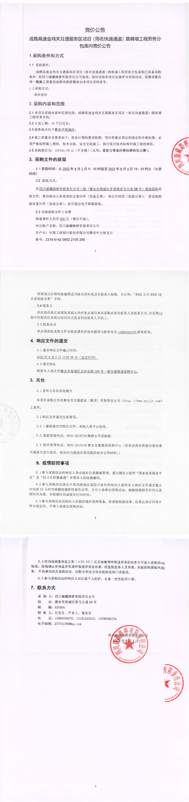 四川康藏路橋有限責(zé)任公司成雅高速金雞關(guān)互通服務(wù)區(qū)項(xiàng)目(雨名快速通道)路肩墻工程勞務(wù)分包庫內(nèi)競價公告