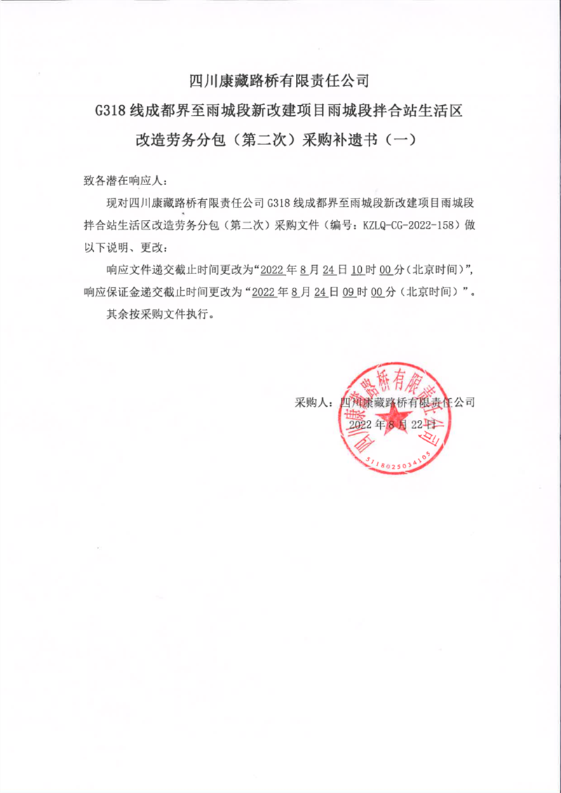 四川康藏路橋有限責(zé)任公司G318線成都界至雨城段新改建項目雨城段拌合站生活區(qū)改造勞務(wù)分包(第二次)采購補(bǔ)遺書(一)