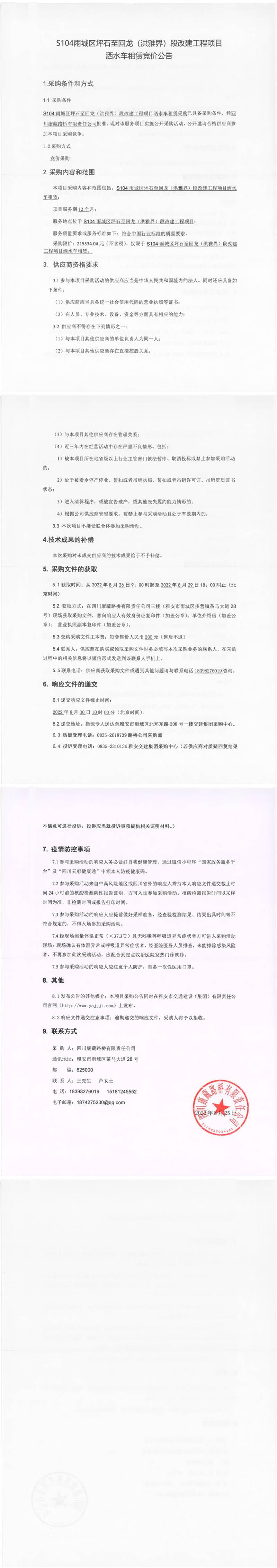 四川康藏路橋有限責(zé)任公司S104雨城區(qū)坪石至回龍(洪雅界)段改建工程項目灑水車租賃競價公告
