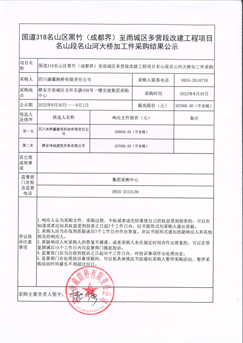四川康藏路橋有限責(zé)任公司國道318名山區(qū)黑竹(成都界)至雨城區(qū)多營段改建工程項(xiàng)目名山段名山河大橋加工件采購結(jié)果公示