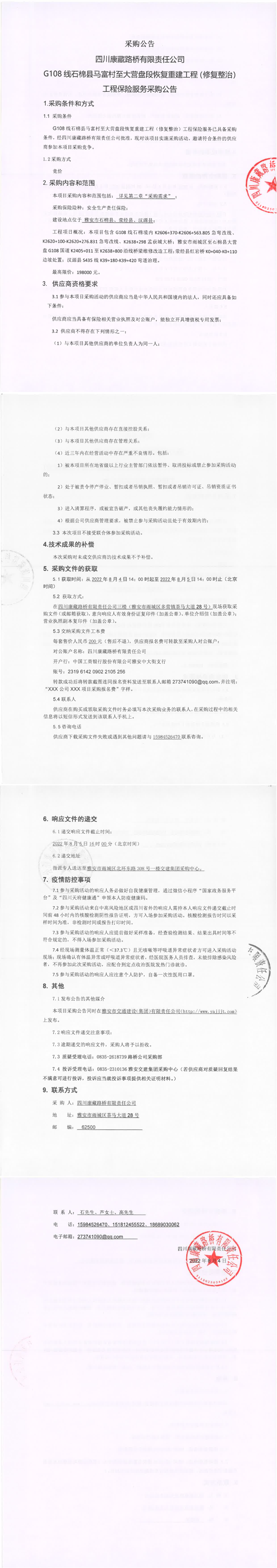 四川康藏路橋有限責(zé)任公司G108線石棉縣馬富村至大營盤段恢復(fù)重建工程(修復(fù)整治)工程保險服務(wù)采購公告