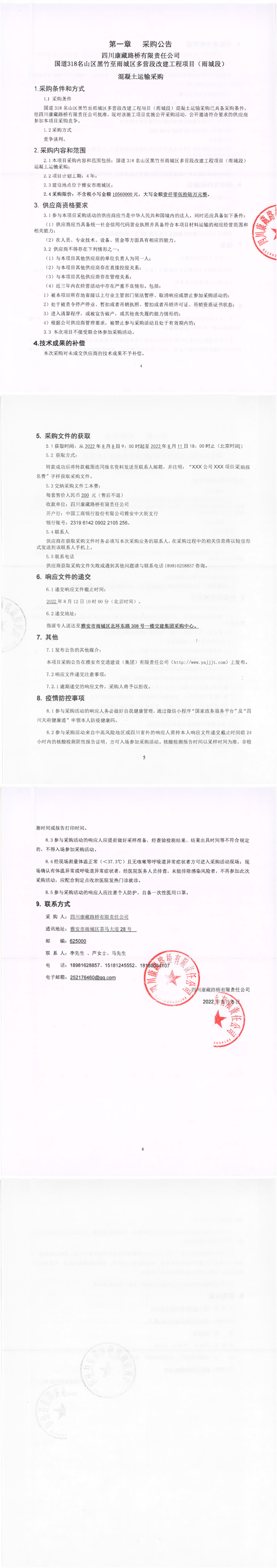 四川康藏路橋有限責(zé)任公司國道318名山區(qū)黑竹至雨城區(qū)多營段改建工程項目(雨城段)混凝土運(yùn)輸采購公告