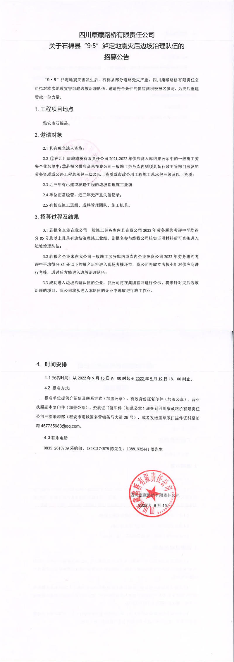 四川康藏路橋有限責任公司關于石棉縣“9·5”瀘定地震災后邊坡治理隊伍的招募公告