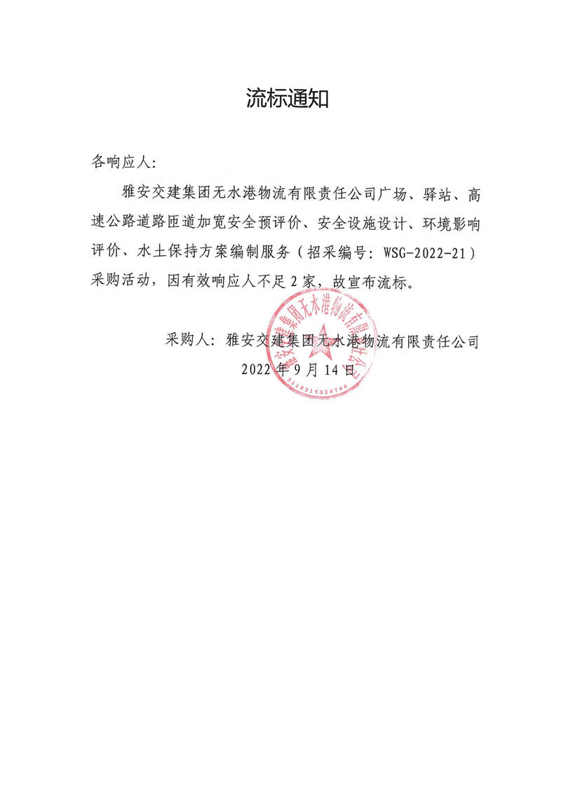 雅安交建集團無水港物流有限責任公司廣場、驛站、高速公路道路匝道加寬安全預(yù)評價、安全設(shè)施設(shè)計、環(huán)境影響評價、水土保持方案編制服務(wù)采購流標通知