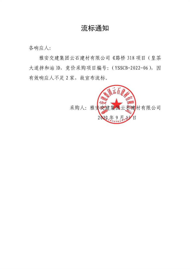 雅安交建集團云石建材有限公司成品料運輸服務(wù)采購(皇茶大道拌和站)流標通知