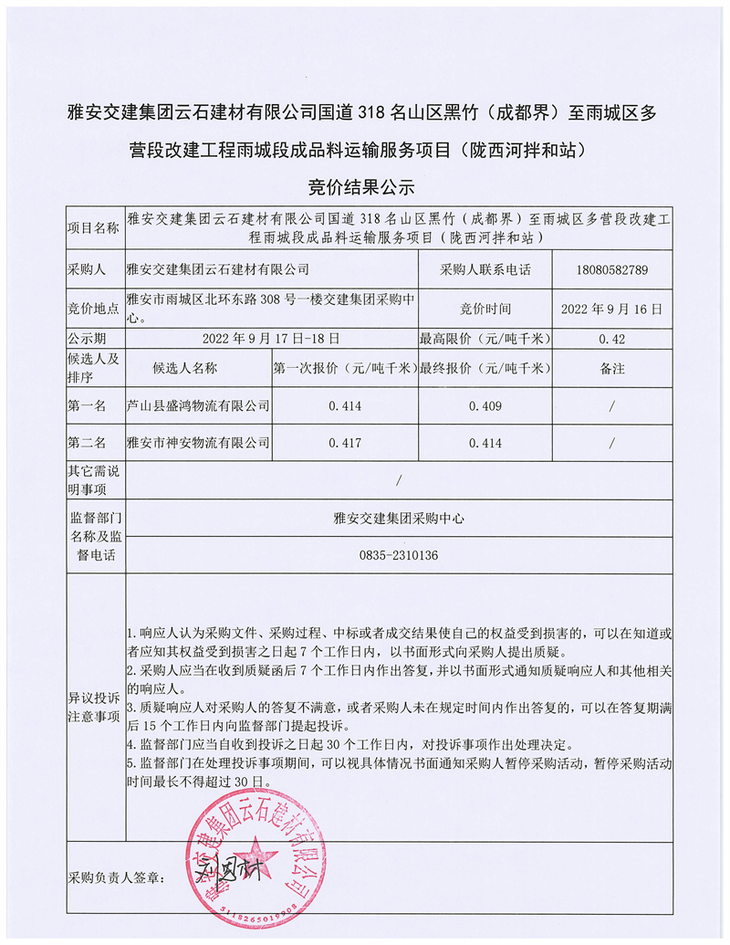雅安交建集團(tuán)云石建材有限公司國道318名山區(qū)黑竹(成都界)至雨城區(qū)多營段改建工程雨城段成品料運(yùn)輸服務(wù)項(xiàng)目(皇茶大道拌和站)競價(jià)結(jié)果公示
