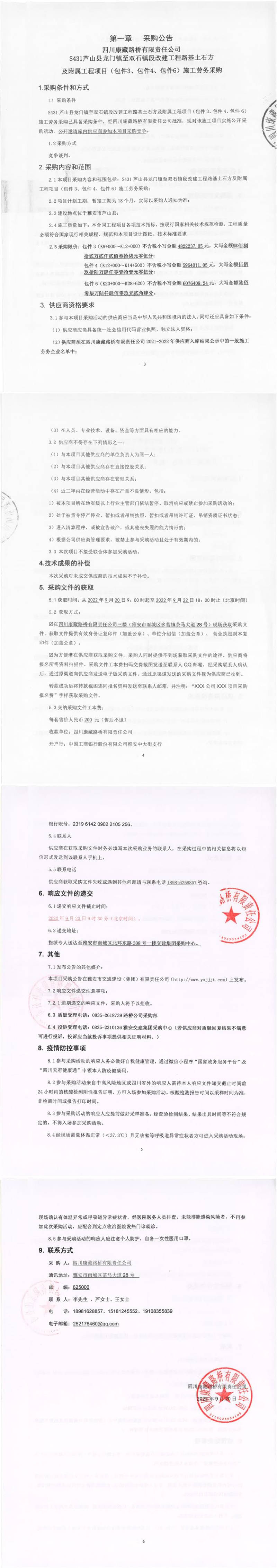 四川康藏路橋有限責任公司S431蘆山縣龍門鎮(zhèn)至雙石鎮(zhèn)段改建工程路基土石方及附屬工程項目(包件3、包件4、包件6)施工勞務(wù)采購公告