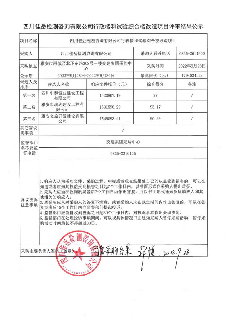 四川佳岳檢測咨詢有限公司行政樓和試驗綜合樓改造項目評審結(jié)果公示