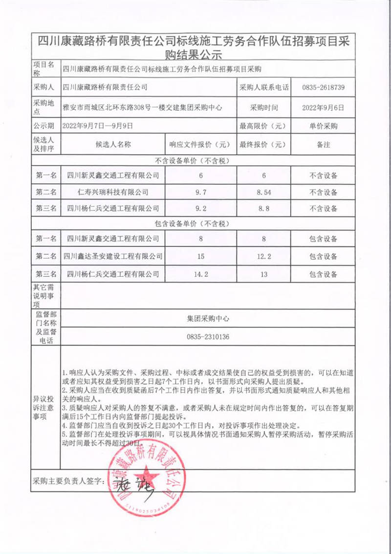四川康藏路橋有限責(zé)任公司標(biāo)線施工勞務(wù)合作隊(duì)伍招募項(xiàng)目采購(gòu)結(jié)果公示