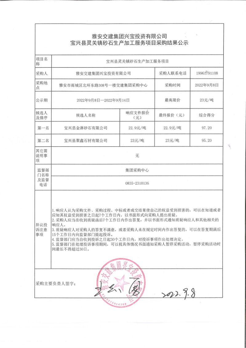 雅安交建集團興寶投資有限公司寶興縣靈關(guān)鎮(zhèn)砂石生產(chǎn)加工服務(wù)項目采購結(jié)果公示