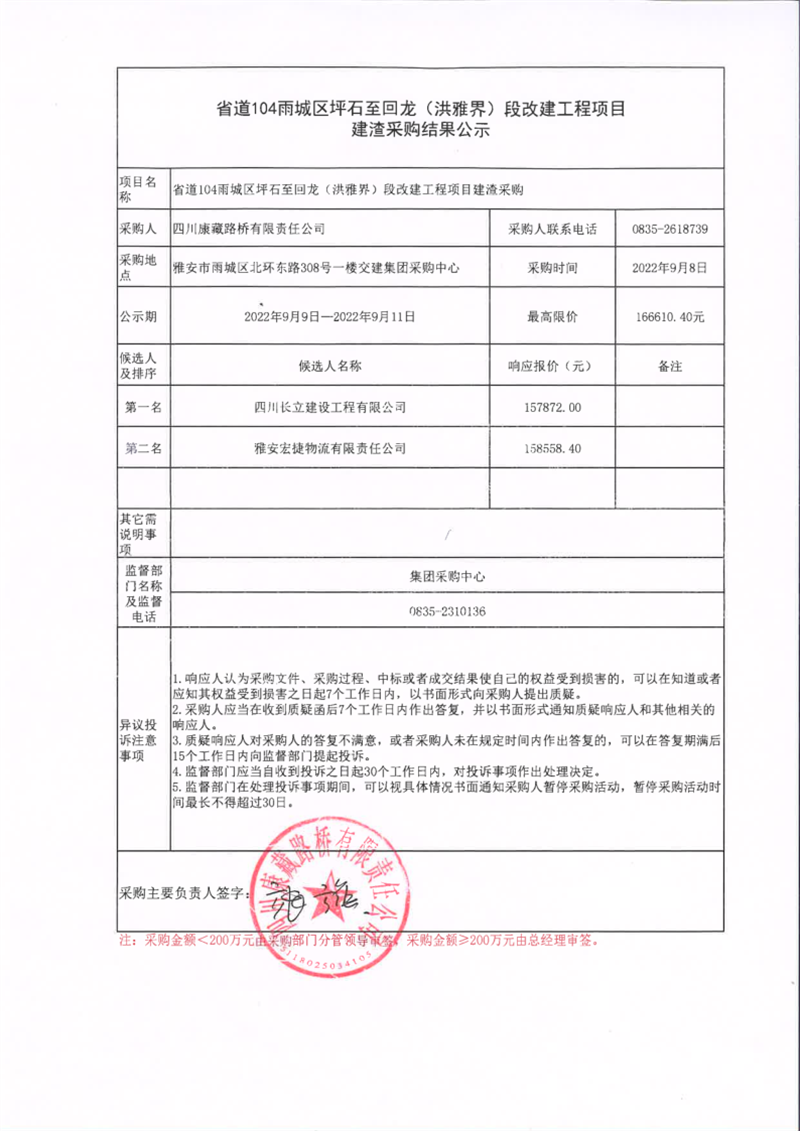 四川康藏路橋有限責(zé)任公司省道104雨城區(qū)坪石至回龍(洪雅界)段改建工程項(xiàng)目建渣采購結(jié)果公示