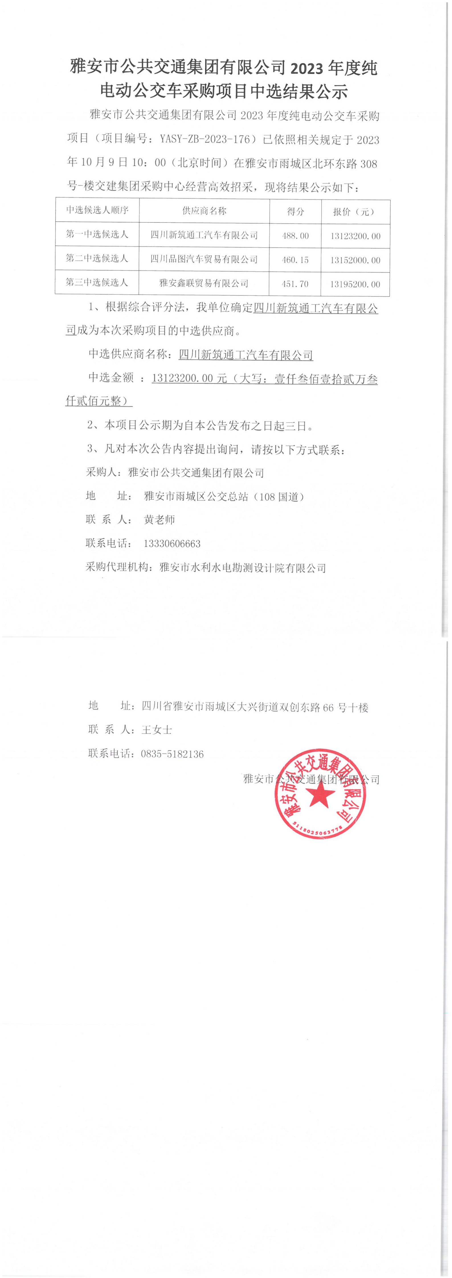 雅安市公共交通集團(tuán)有限公司2023年度純電動公交車采購項目中選結(jié)果公示