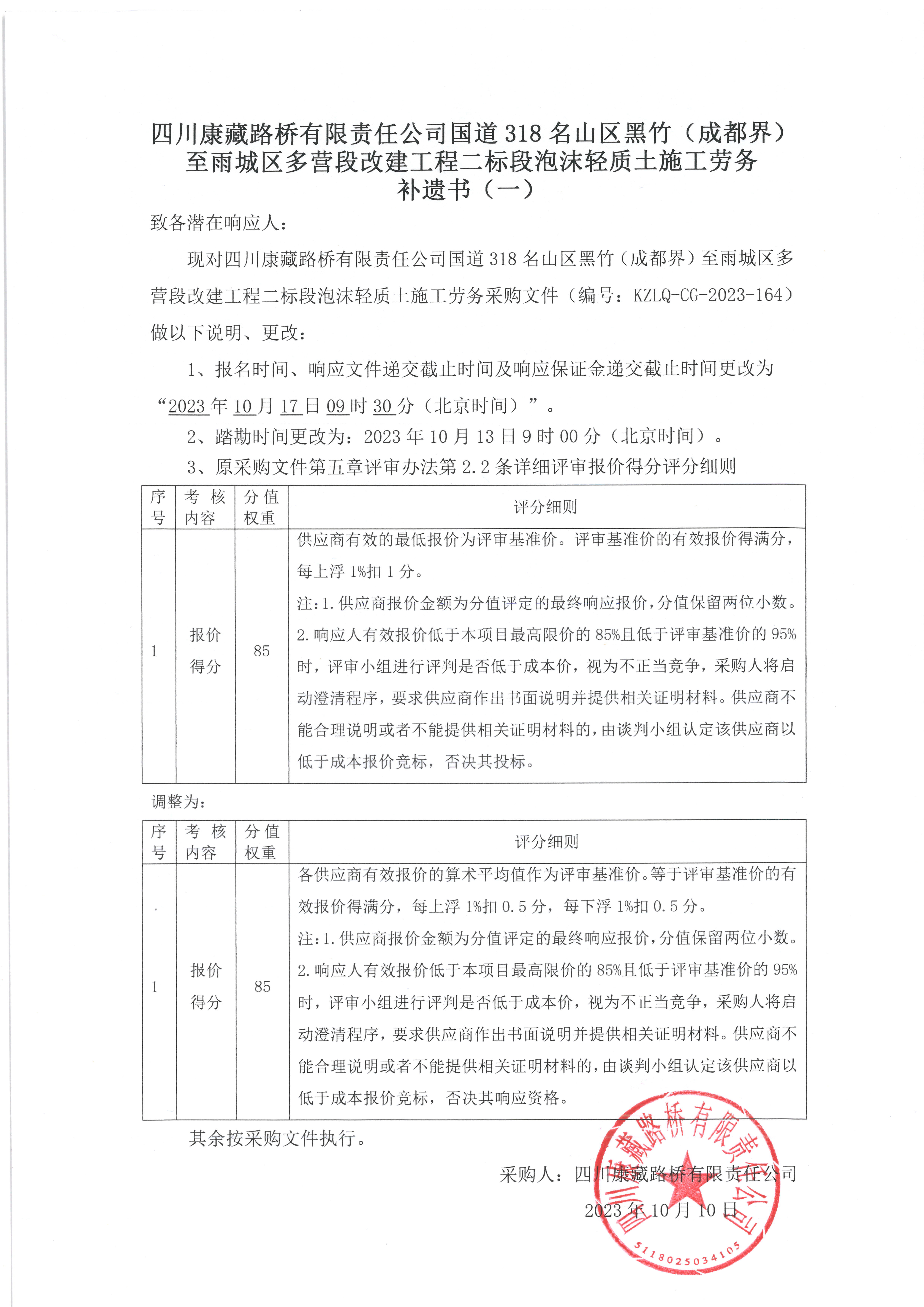 四川康藏路橋有限責(zé)任公司國道318名山區(qū)黑竹(成都界)至雨城區(qū)多營段改建工程二標(biāo)段泡沫輕質(zhì)土施工勞務(wù)補遺書(一)