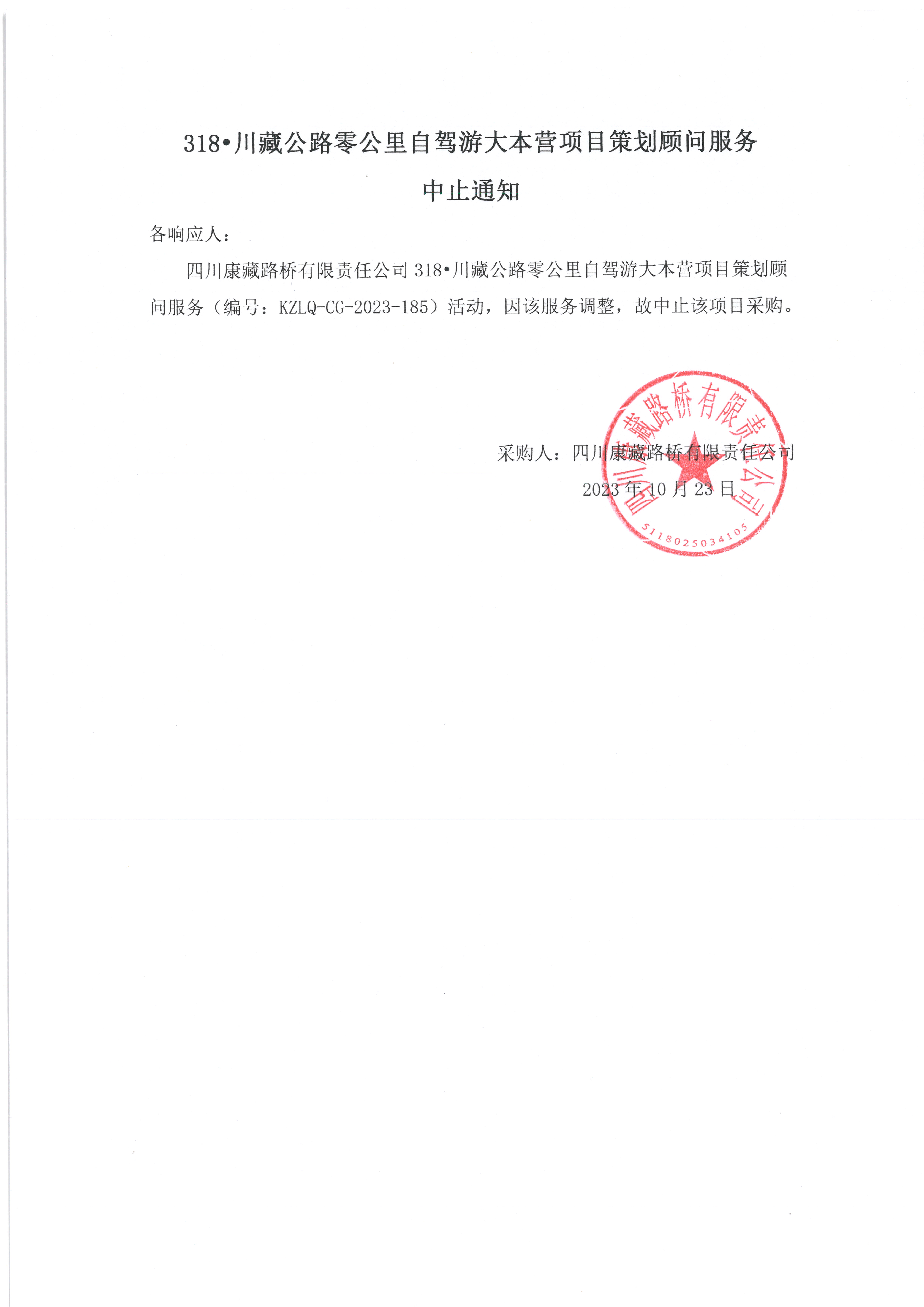 四川康藏路橋有限責(zé)任公司318•川藏公路零公里自駕游大本營項(xiàng)目策劃顧問服務(wù)中止通知