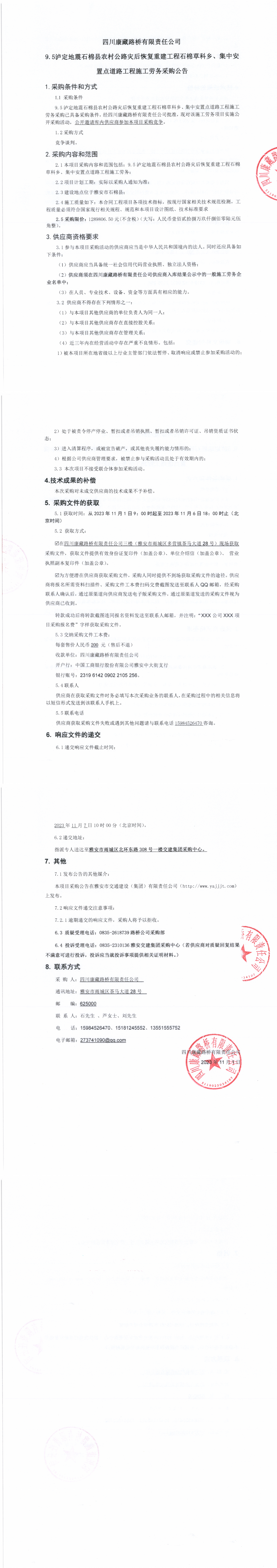 四川康藏路橋有限責任公司9.5瀘定地震石棉縣農(nóng)村公路災后恢復重建工程石棉草科鄉(xiāng)、集中安置點道路工程施工勞務采購公告