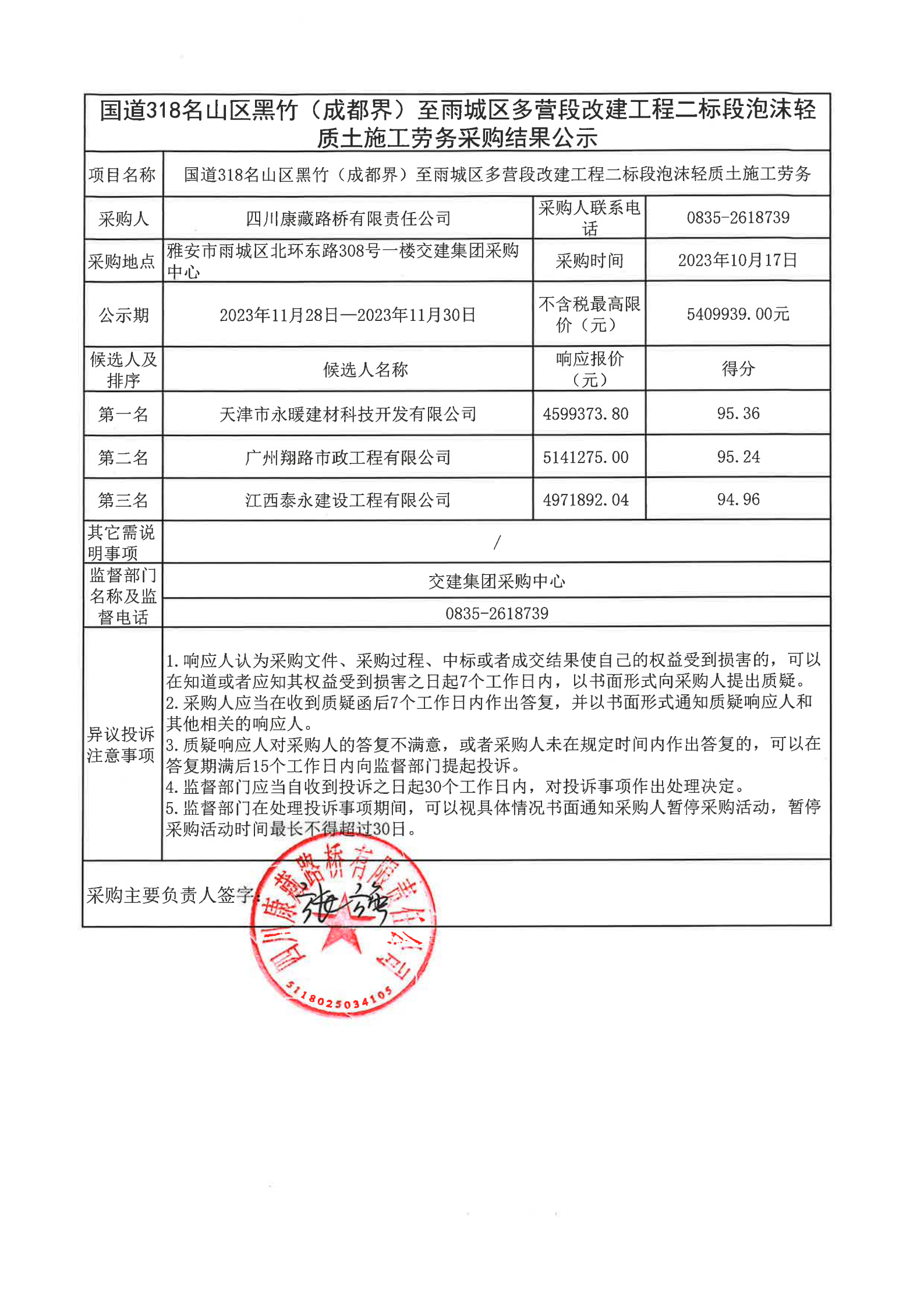 四川康藏路橋有限責(zé)任公司國(guó)道318名山區(qū)黑竹(成都界)至雨城區(qū)多營(yíng)段改建工程二標(biāo)段泡沫輕質(zhì)土施工勞務(wù)采購(gòu)結(jié)果公示