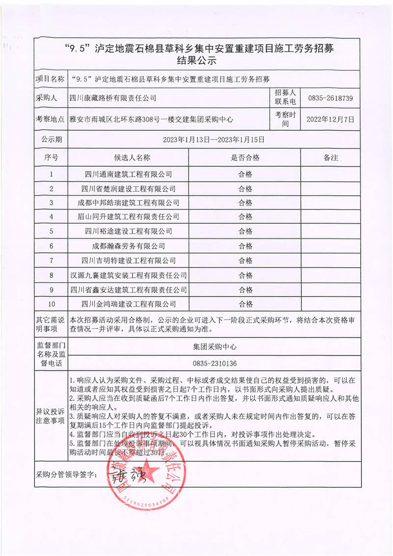 四川康藏路橋有限責任公司“9.5”瀘定地震石棉縣草科鄉(xiāng)集中安置重建項目施工勞務招募結果公示