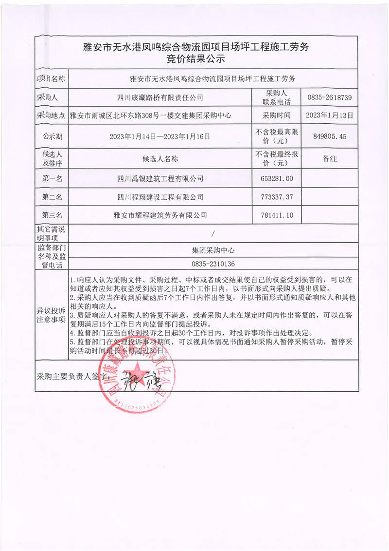 四川康藏路橋有限責(zé)任公司雅安市無水港鳳鳴綜合物流園項目場坪工程施工勞務(wù)競價結(jié)果公示