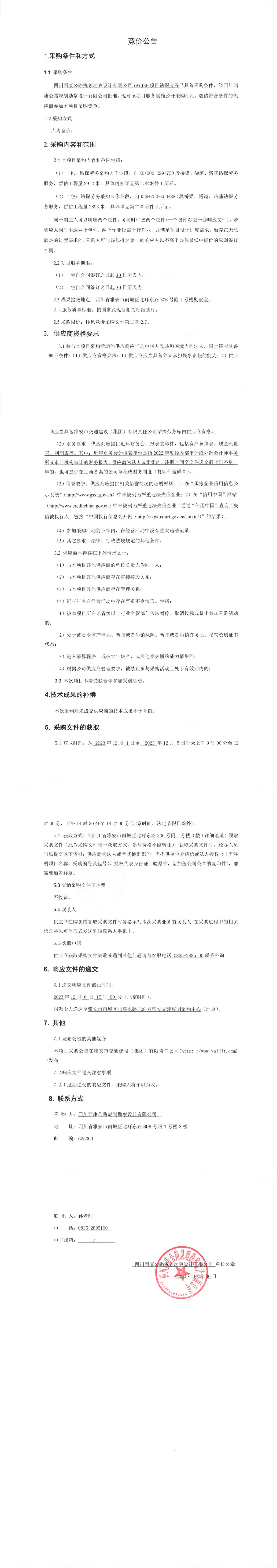 四川西康公路規(guī)劃勘察設(shè)計(jì)有限公司YAYJSP目鉆探勞務(wù)競(jìng)價(jià)公告