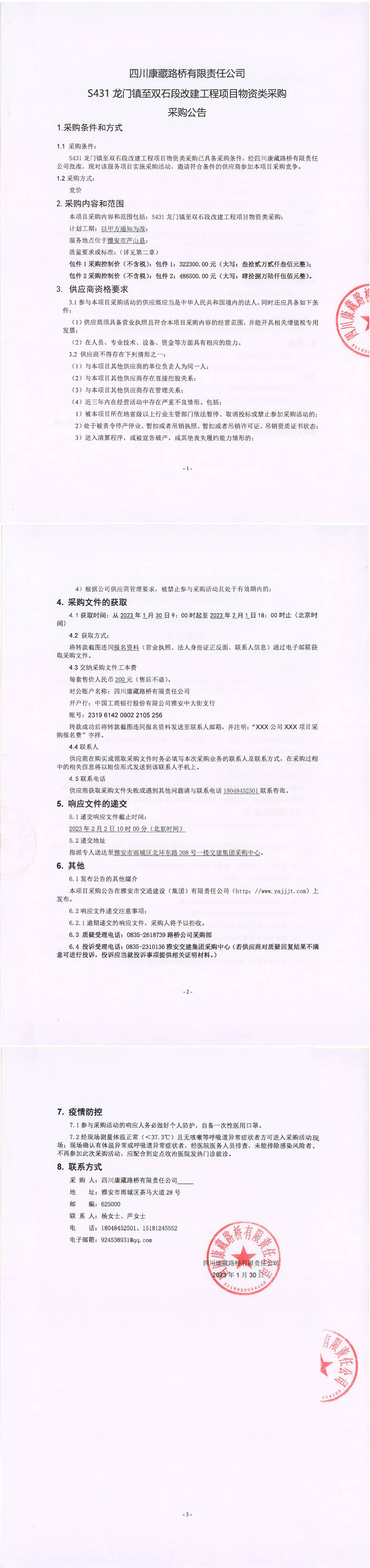 四川康藏路橋有限責任公司S431龍門鎮(zhèn)至雙石段改建工程項目物資類采購采購公告