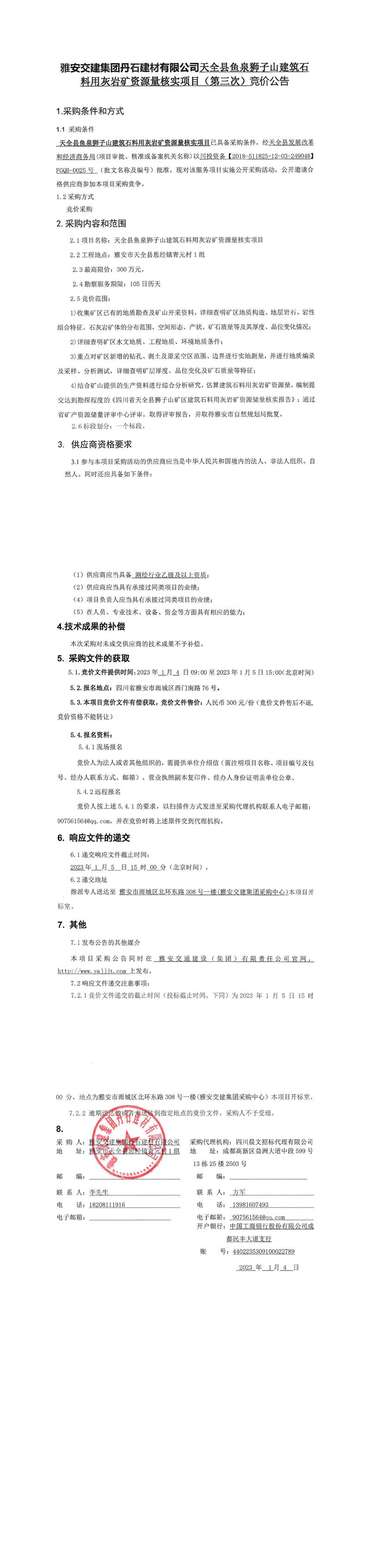 雅安交建集團(tuán)丹石建材有限公司天全縣魚泉獅子山建筑石料用灰?guī)r礦資源量核實(shí)項(xiàng)目(第三次)競價公告